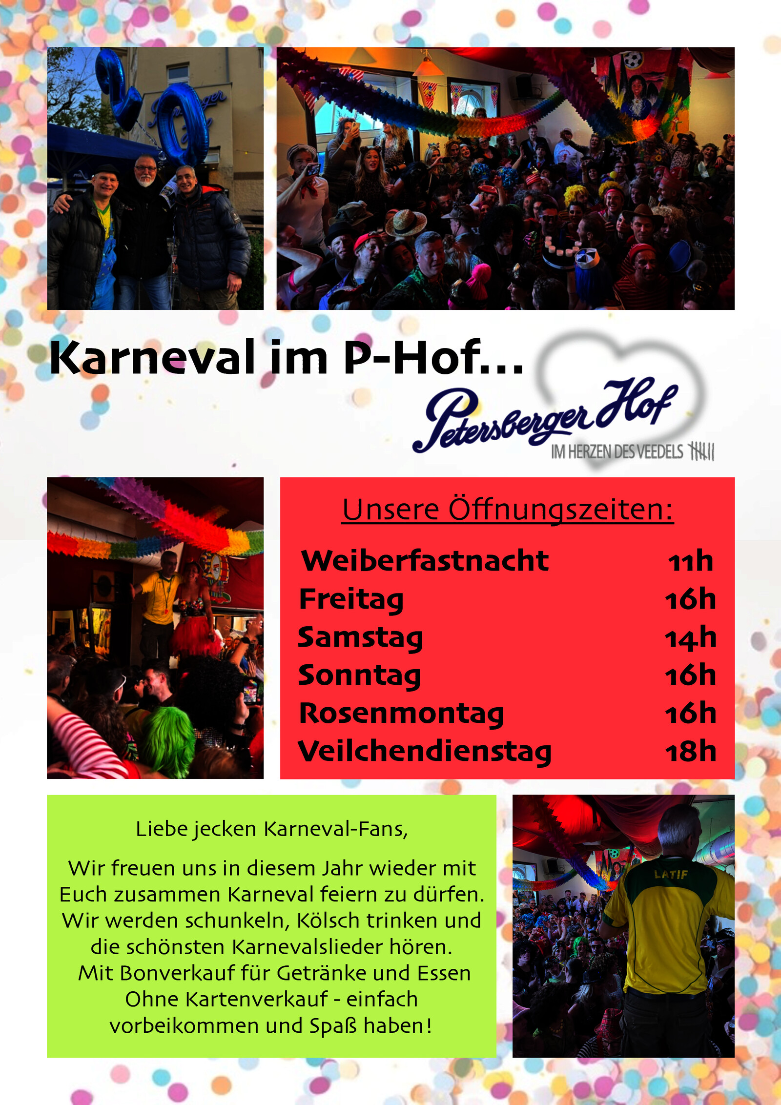 „Im Herzen des Veedels... aus Tradition” ist das Motto des Petersberger Hofes, das treffender nicht sein könnte und das seit über einhundert Jahren. So treffen sich hier nicht nur Klettenberger. Der Besuch in der urgemütlichen Veedels-Kneipe bedeutet für die unzähligen Stammgäste jeglichen Alters viel mehr, als nur essen zu gehen.